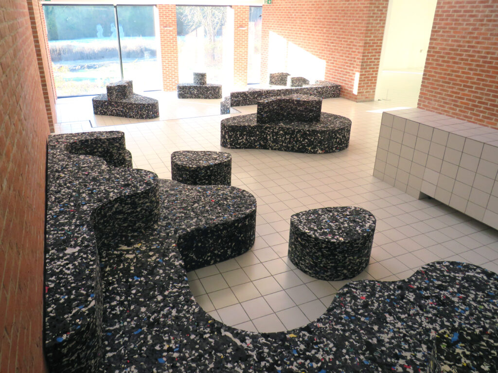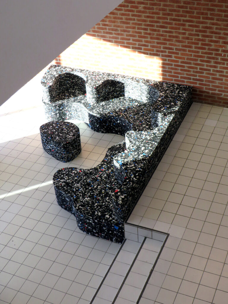 Dans le cadre de son intervention pour le LaM, Clémence Seilles conçoit une série de mobiliers pensés pour les espaces d’accueil, en dialogue étroit avec les deux architectures emblématiques du lieu : la rigueur cubique de Roland Simounet et les formes organiques et ajourées de Manuelle Gautrand. Inspiré à la fois par les trames pavées de Simounet et par les motifs aléatoires des moucharabiehs de Gautrand, le projet propose des formes contrastées mais complémentaires, adaptées aux usages spécifiques.
