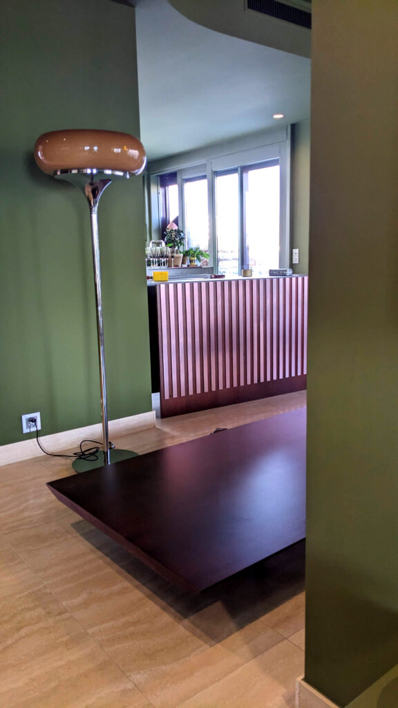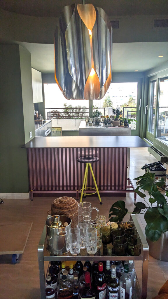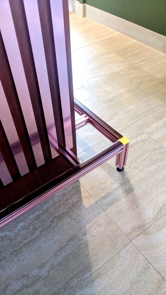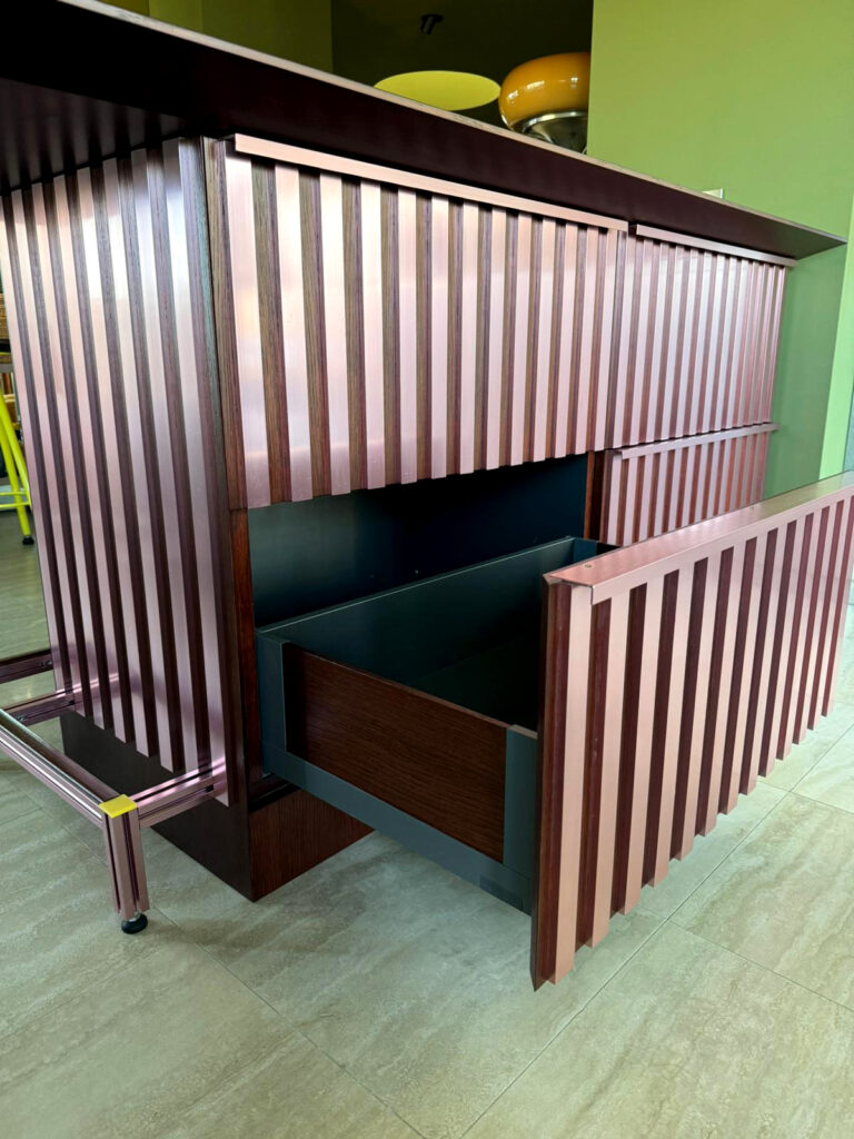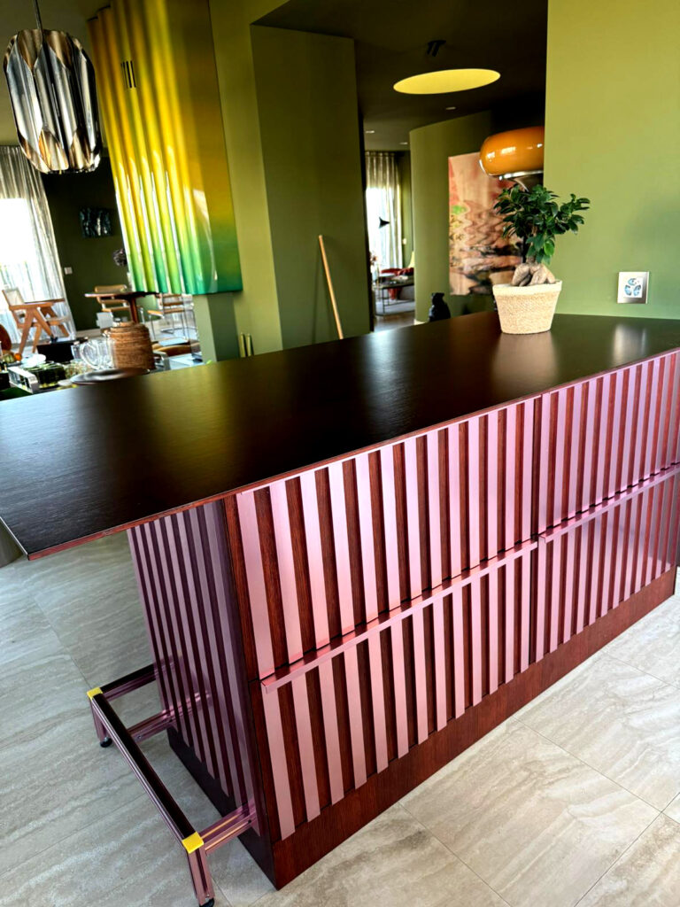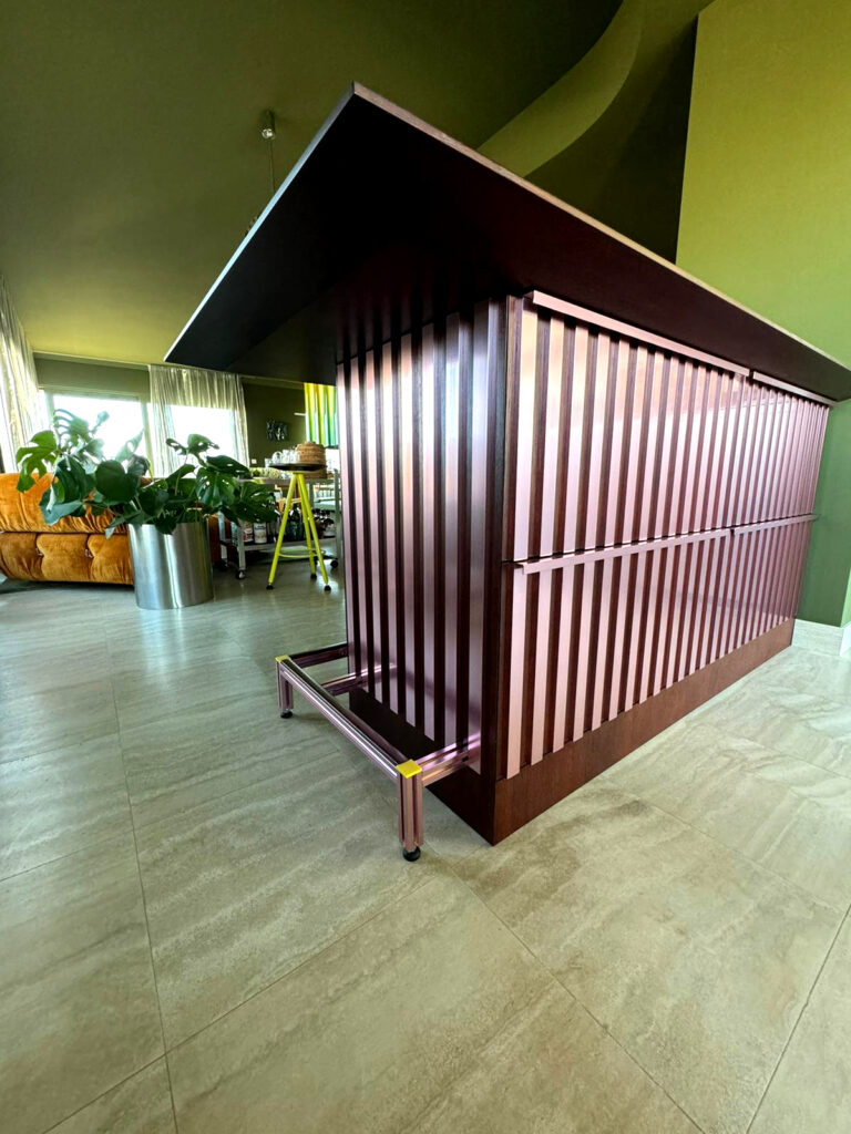 The design draws inspiration from the material palette and tones of the home, integrating seamlessly into its environment. This bespoke piece serves as a subtle yet striking divider between the kitchen and living area. Its strong graphic presence is defined by vertical anodized aluminium fins that wrap harmoniously around the structure.