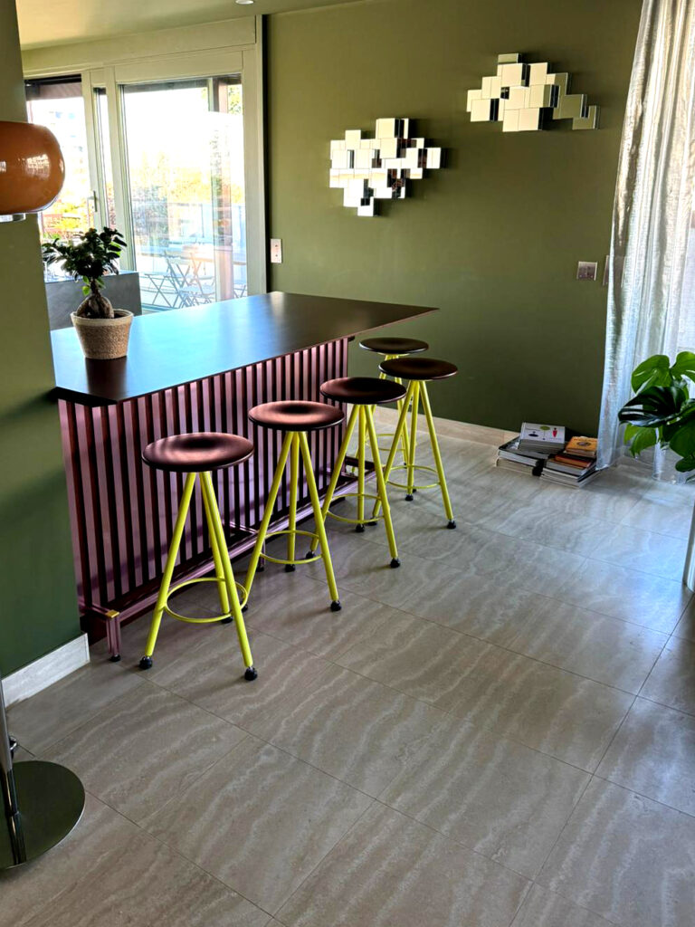 The project explores the dialogue between materials, combining anodized aluminium flat tubes with darkened oak wood. Both functional and refined, the island features high-end kitchen drawers and a generous countertop, allowing a family of six to comfortably gather for breakfasts and dinners. A footrest has been integrated to enhance seating comfort.